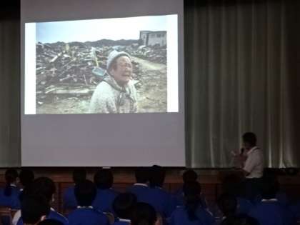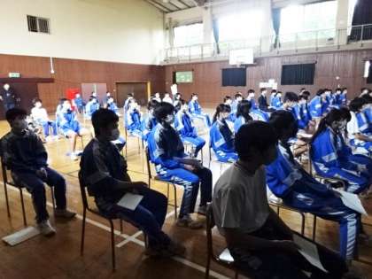 残念ながら今年の総合防災訓練も、感染症対策のために実地はできません。変わりに、「東京消防庁八王子消防署小宮出張所長」に学年ごとに講演していただきました。3年生と7組の様子です。