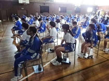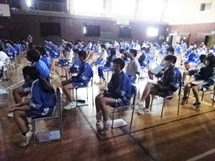 今年は「東京消防庁八王子消防署小宮出張所長」に学年ごとに講演していただきました。