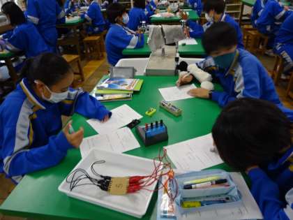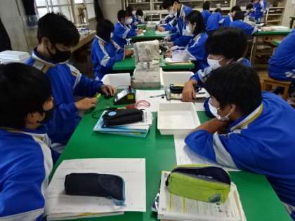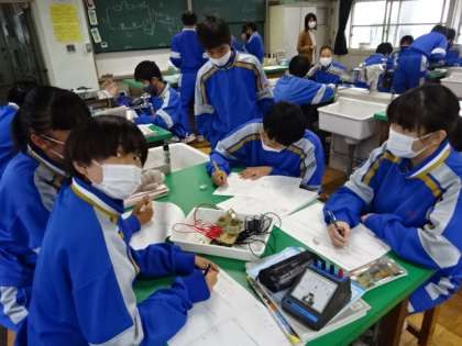 2年4組、理科。「並列回路に流れる電流の大きさを調べる」