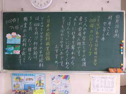 学年掲示板。1年。セレクト本。「2030年のハローワーク」「日本の給料職業図鑑」