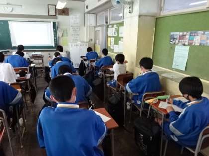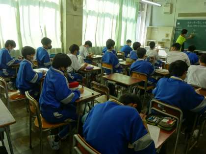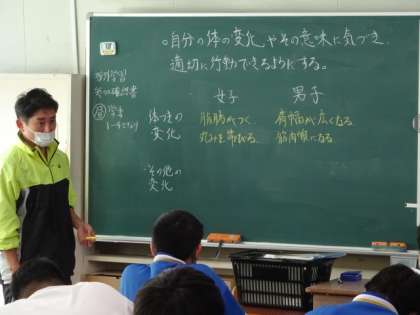 1年1・2組、体育男子。「自分の体の変化やその意味に気づき適切に行動できるようにする」