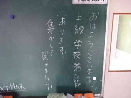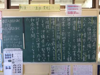 学年掲示板。上級学校講話(2年)、大量の軽石(3年)。