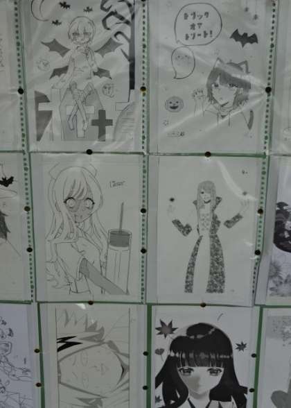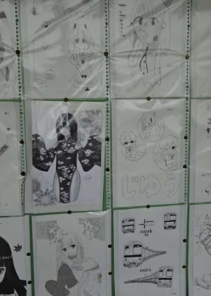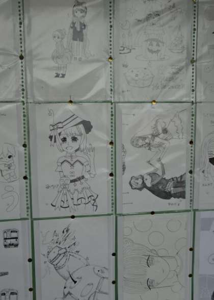 中央校舎2階職員室前の展示。今回は「美術文芸部原画展示」です。