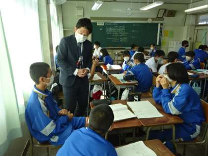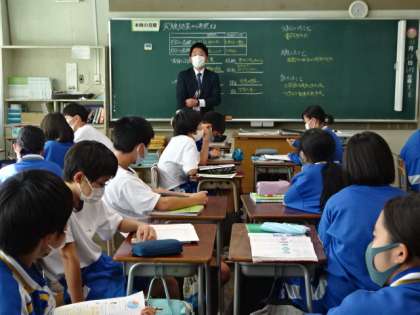 1年1組、理科。教育実習の先生の授業です。「実験結果から考察する」