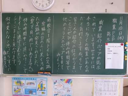 学年掲示板。職業POP(1年)集中して(2年)ツバル(3年)