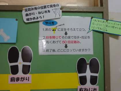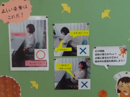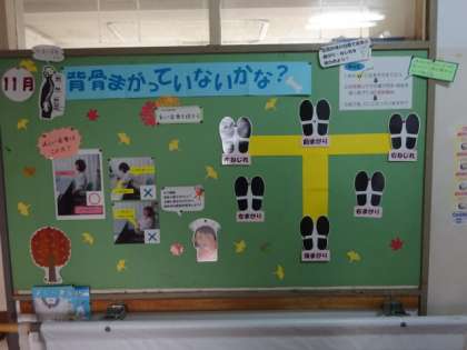 11月の保健室前掲示板。「背骨まがっていないかな?」