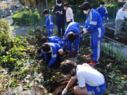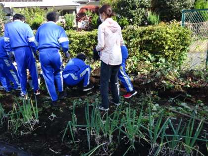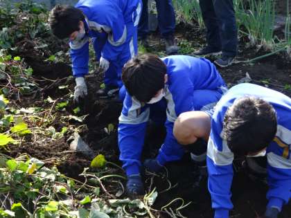 7組。少し早く試験が終わり、総合的な学習の時間で、収穫体験です。テニスコート横の畑で、大きなさつま芋と里芋が、たくさんとれました。