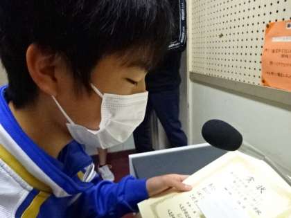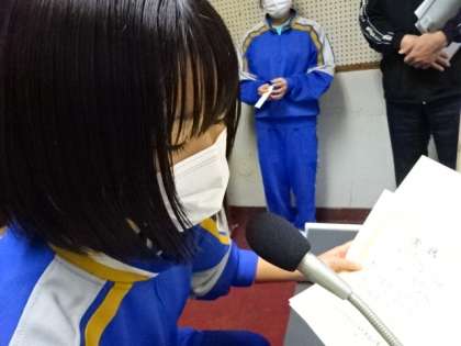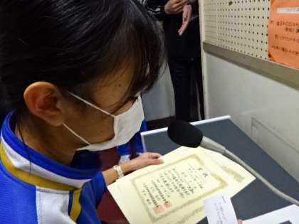 今朝は放送の全校朝礼でした。陸上部の表彰が続きました。賞状を授与された後、今後の抱負をひと言話します。