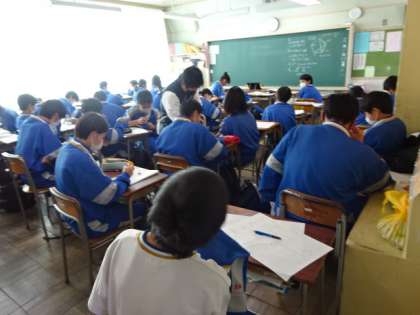 2年4組、数学。「期末考査の返却と解説」