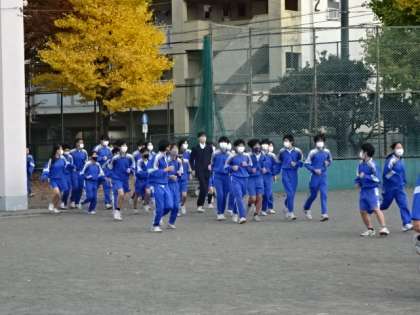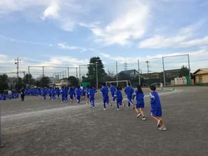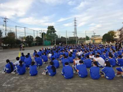 地震想定の避難訓練です。約2年ぶりに、校庭に全員が避難しました。