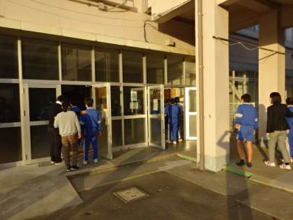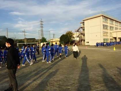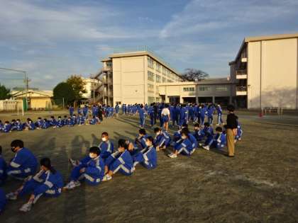 地震想定の避難訓練です。約2年ぶりに、校庭に全員が避難しました。
