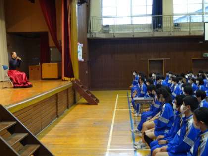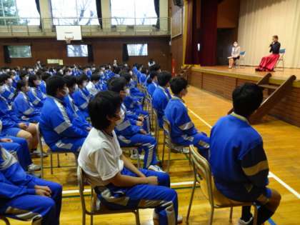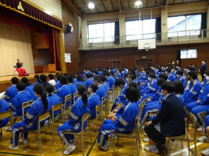 今年度の「道徳授業地区公開講座」は元宝塚雪組の沙月愛奈さんに講演していただきました。お話の中の「小さな花をたくさん咲かせる努力が大切」「自分の考えで未来は変わる」「チャレンジしよう」という言葉は、とても印象深かったようです。ありがとうございました。3年生の様子です
