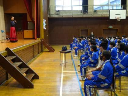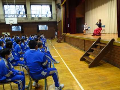 今年度の「道徳授業地区公開講座」は元宝塚雪組の沙月愛奈さんに講演していただきました。お話の中の「小さな花をたくさん咲かせる努力が大切」「自分の考えで未来は変わる」「チャレンジしよう」という言葉は、とても印象深かったようです。ありがとうございました。1年生の様子です
