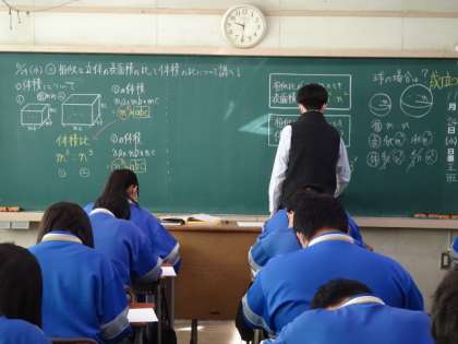 3年3・4組。数学。「相似な立体の表面積比、体積比」。