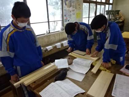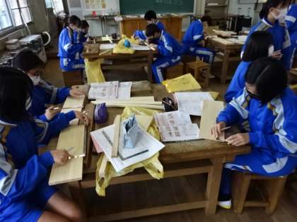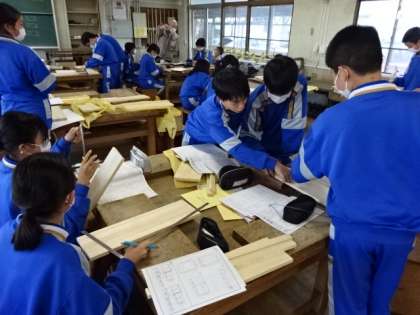1年1組、技術。木材加工。同じ材料から10種類の作品が製作できるそうです。CDラック、調味料入れ、メルヘンラック……。
