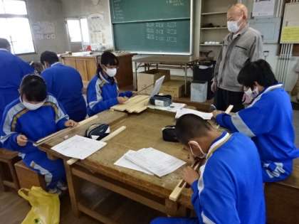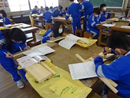 1年1組、技術。木材加工。同じ材料から10種類の作品が製作できるそうです。CDラック、調味料入れ、メルヘンラック……。