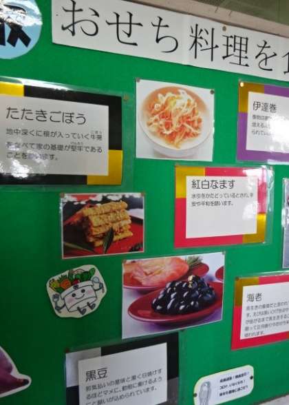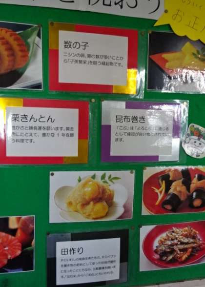 12月の食育掲示板は、「おせち料理を食べて新年を祝おう」