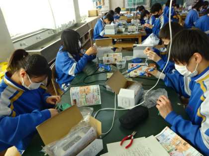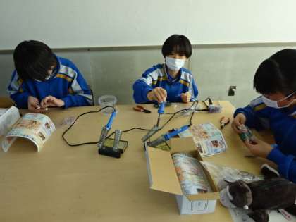 2年4組、技術。前照灯付きラジオの製作。