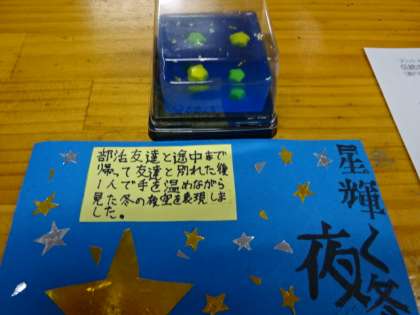 2年1組、美術。和菓子鑑賞会。他の人の作品から良い技術やアイデアを学ぼう!