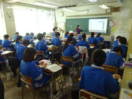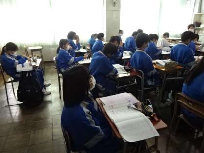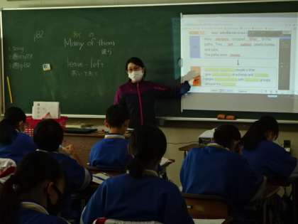 1年2組、英語。先生の問いかけに対する反応がとても速いです。ゆっくり考える場面とのメリハリが大切です。