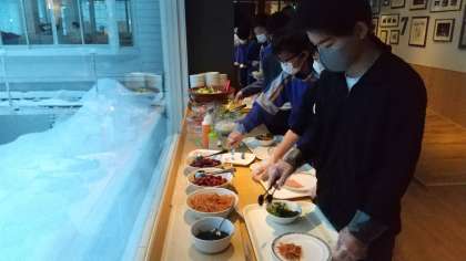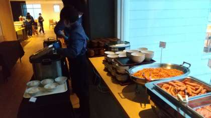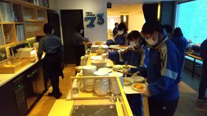 朝食はビュッフェ形式ですが、十分間隔を開けながらとるようにしています。