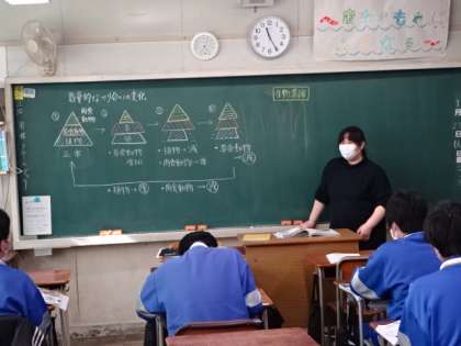 3年3組、理科。「数量的なつり合いの変化、生物濃縮」
