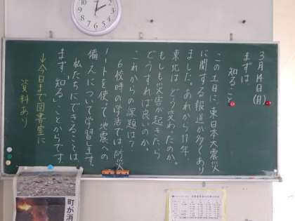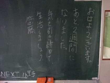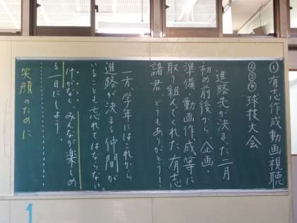学年掲示板。まずは知ること(1年)あと2週間(2年)笑顔のために(3年)