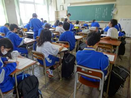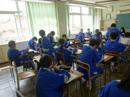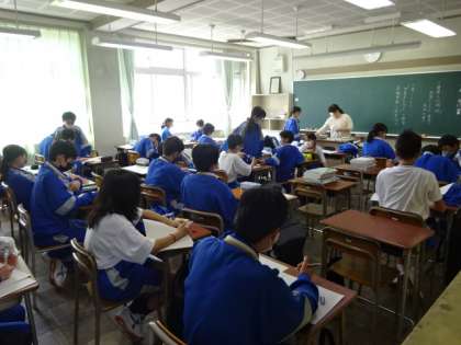 今日はまだ学級活動の時間です。1年生は「中学生になって」の作文を書いています。何を書いているのかな。3組。