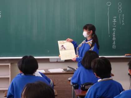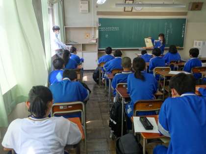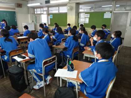 今日はまだ学級活動の時間です。1年生は「中学生になって」の作文を書いています。何を書いているのかな。5組。