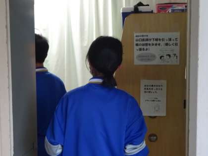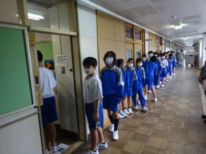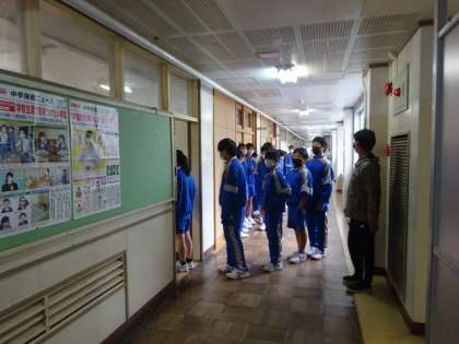 今日は全校生徒が眼科検診を受けます。1年生の様子です。