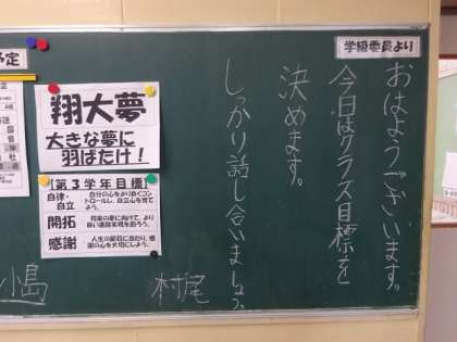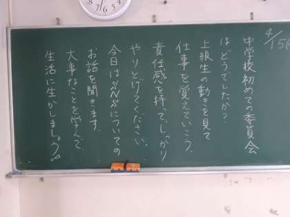 学年掲示板。初めての委員会(1年)工藤直子(2年)クラス目標(3年)