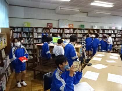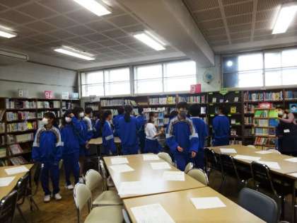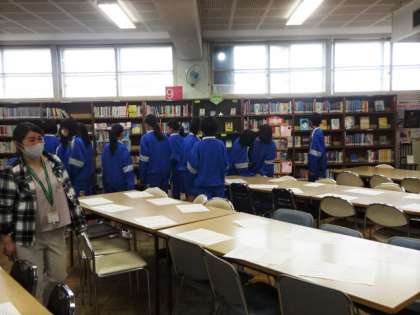 学校司書の学校図書館オリエンテーションです。1年生の全クラスで行いました。これは3組の様子です。