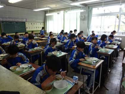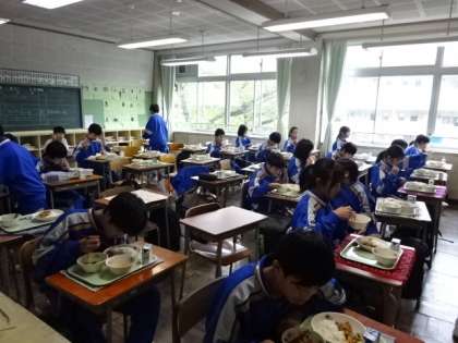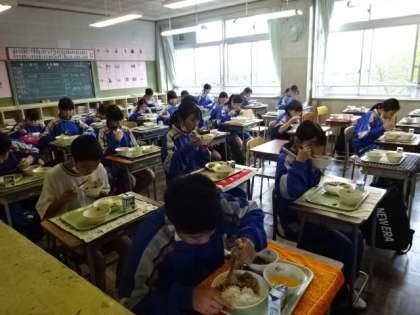 給食の時間の様子です。今日のメニューはビビンバ。1年生。