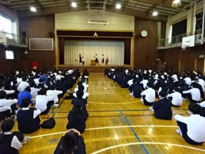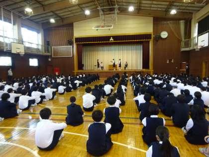 今日の離任式に3名の先生方がいらっしゃいました。離任式の様子です。