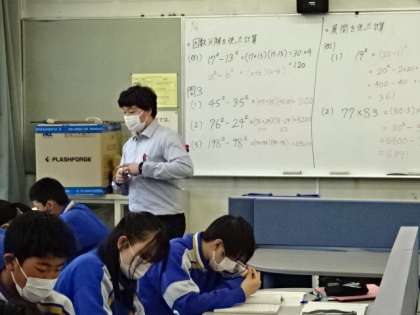 3年3・4組、数学。因数分解を使った計算。