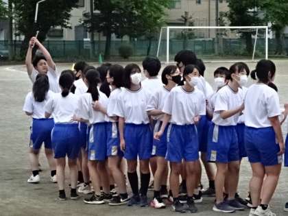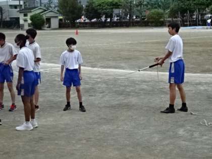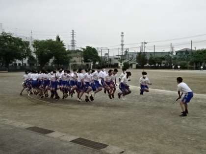 2年1組、体育。リレーの練習の後に大なわ跳びです。