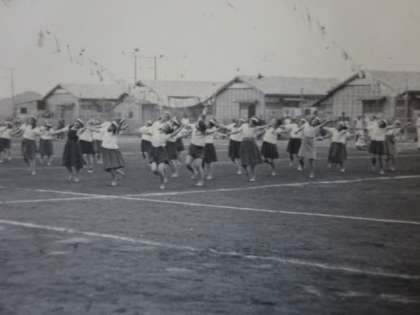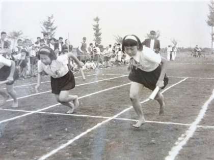 昭和29年度の体育祭。走る競技は、男女関係なく基本は裸足。女子のダンス。