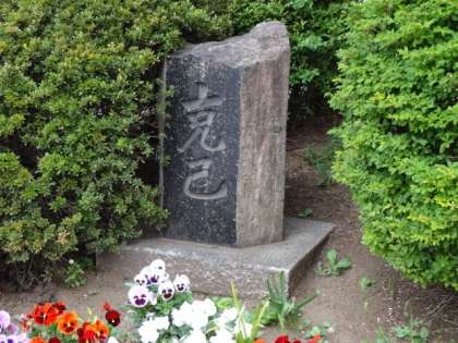 平成9年、創立50周年を記念して、正面玄関前の小庭園に設置された石碑。「克己」(こっき。意志の力で、自らの欲望や邪念に打ち勝つことの意)と彫られています。