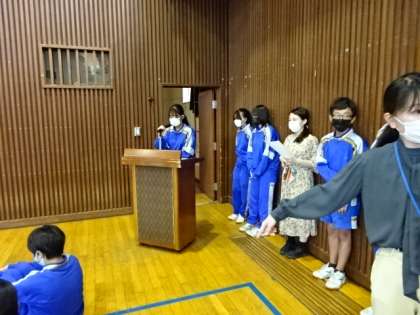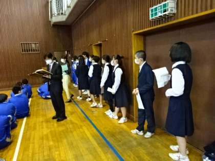 体育館に全校生徒が集まって行う生徒会朝礼は、約3年ぶりです。ということは全校生徒にとって初めての生徒会朝礼ということでした。しかし、案ずるより産むが易し。生徒の力で立派に行ってくれました。