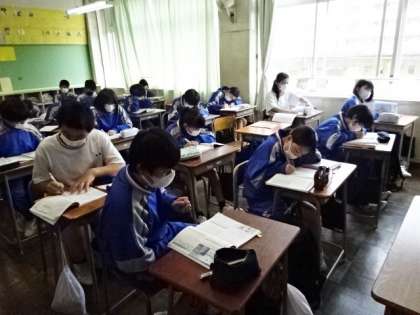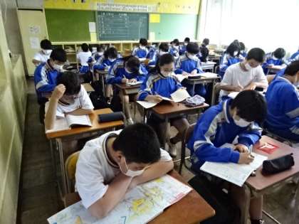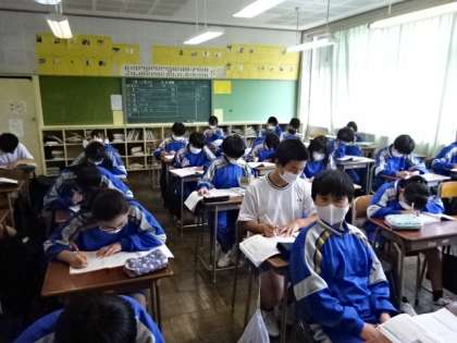 1年生が初めての中間考査に向けて、昼休みに勉強する取組を行っています。2組。