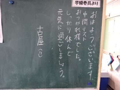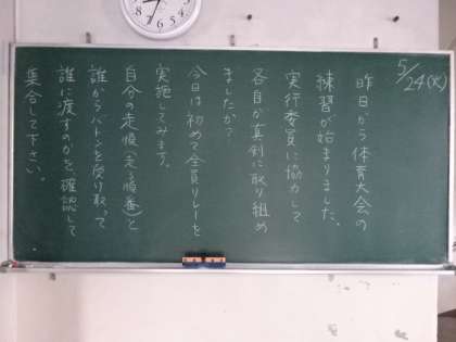 学年掲示板。今日は初めて全員リレー(1年)今日も継続していこう(2年)中間テストおつかれ様でした(3年)