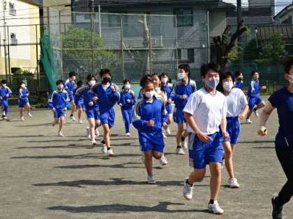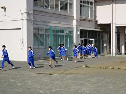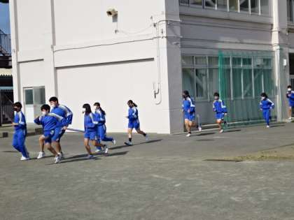 地震想定の避難訓練を行いました。外に出たら走って集合場所へ。