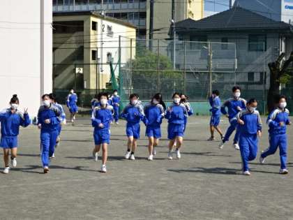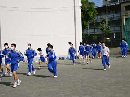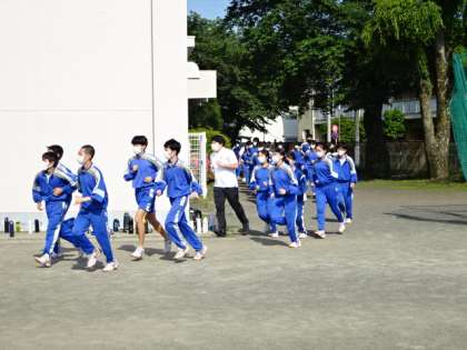 地震想定の避難訓練を行いました。外に出たら走って集合場所へ。