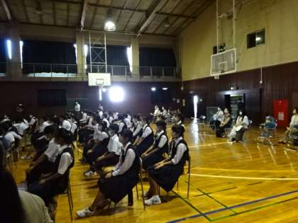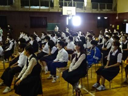 1年生の防災訓練(講話)の様子です。八王子消防署小宮出張所長の日高さんの講演です。