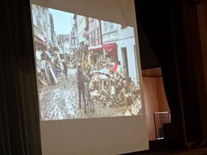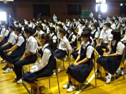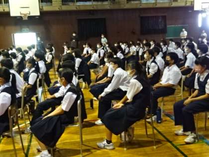 1年生の防災訓練(講話)の様子です。八王子消防署小宮出張所長の日高さんの講演です。