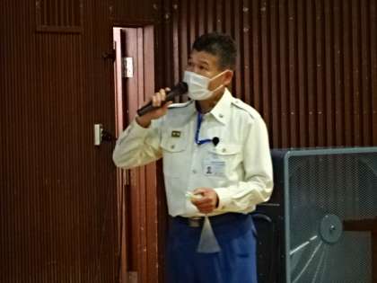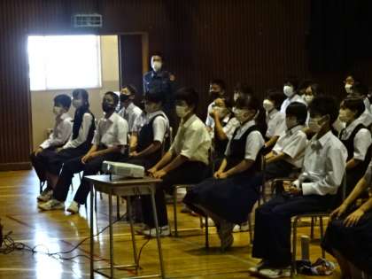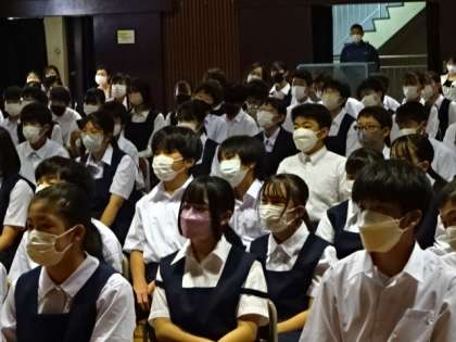 1年生の防災訓練(講話)の様子です。八王子消防署小宮出張所長の日高さんの講演です。