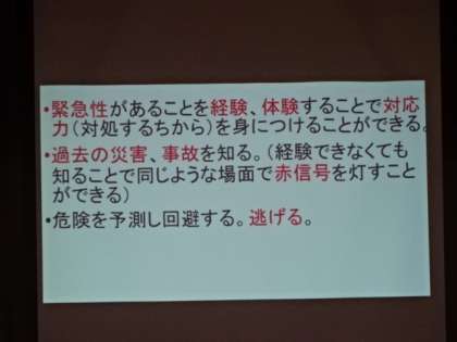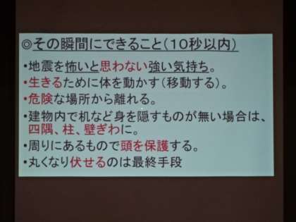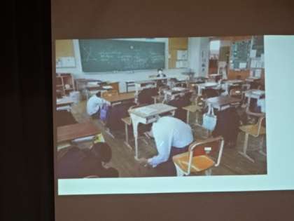 1年生の防災訓練(講話)の様子です。八王子消防署小宮出張所長の日高さんの講演です。