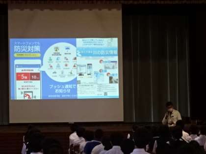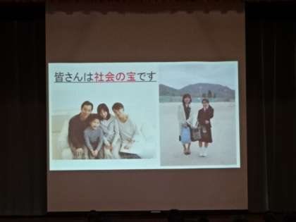 1年生の防災訓練(講話)の様子です。八王子消防署小宮出張所長の日高さんの講演です。