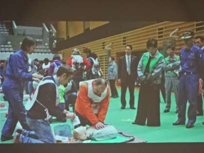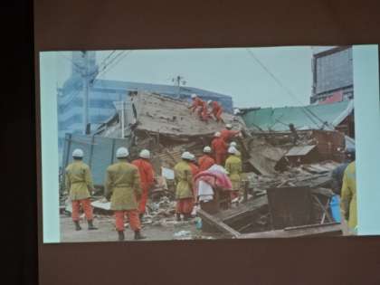 1年生の防災訓練(講話)の様子です。八王子消防署小宮出張所長の日高さんの講演です。