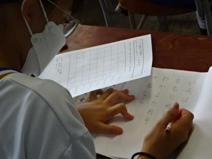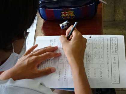 1年4組、国語。書写、いろは歌。